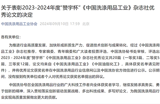 關于(yu)表彰2023-2024年(nian)度“贊宇杯”《中(zhong)國(guo)洗滌用(yong)品(pin)工(gong)業》雜志(zhì)社(she))優(you)秀論文(wén)的(de)決定